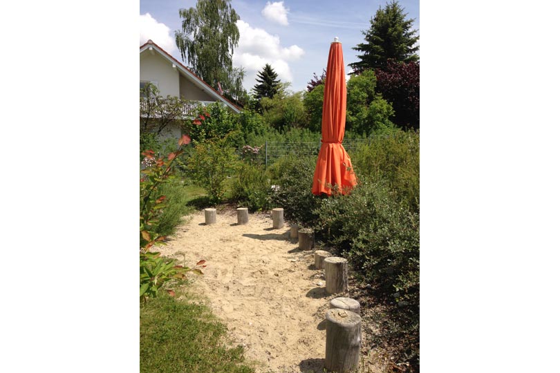 Bogenförmig gepflanzte Spierstrauchhecken trennen die privaten von den öffentlichen Bereichen und geben zur Blütezeit einen spannenden Aspekt. Der Freibereich der Krippe wurde in verschiedene Zone aufgeteilt. Ein Asphaltband als Bobby-Car Bahn verbindet alle Bereiche. Liebvoll gestaltete Spielgeräte aus Eichenholz von der Fa. ZimmerObst runden das Freiraumangebot für die Kinder ab.