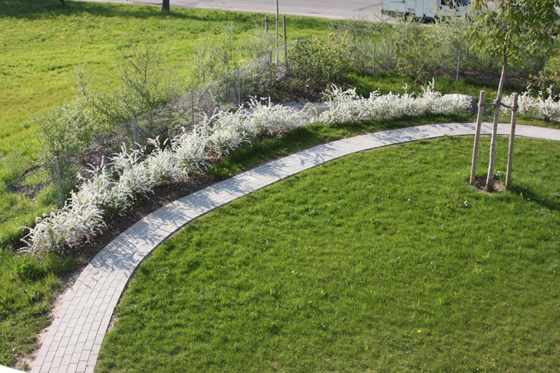 23.04.2015Für einen privaten Bauträger wurde in Unterföhring ein 4seitig geschlossener Wohnhof gestaltet. Neben der notwendigen Erschließung bildet das zentrale Element des Hofes der von einer Spierstrauchhecke eingefasste große Spielbereich.